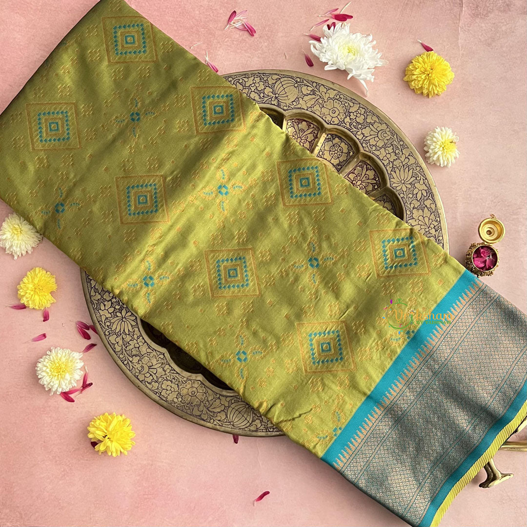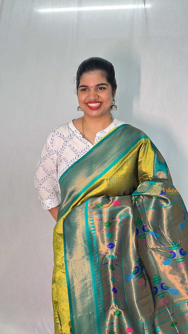 Elevate your style with our Mehndi Green Bandhani Semi Soft Silk Paithani Saree. Made from luxurious bandhani silk, this saree is a perfect blend of traditional and contemporary design.