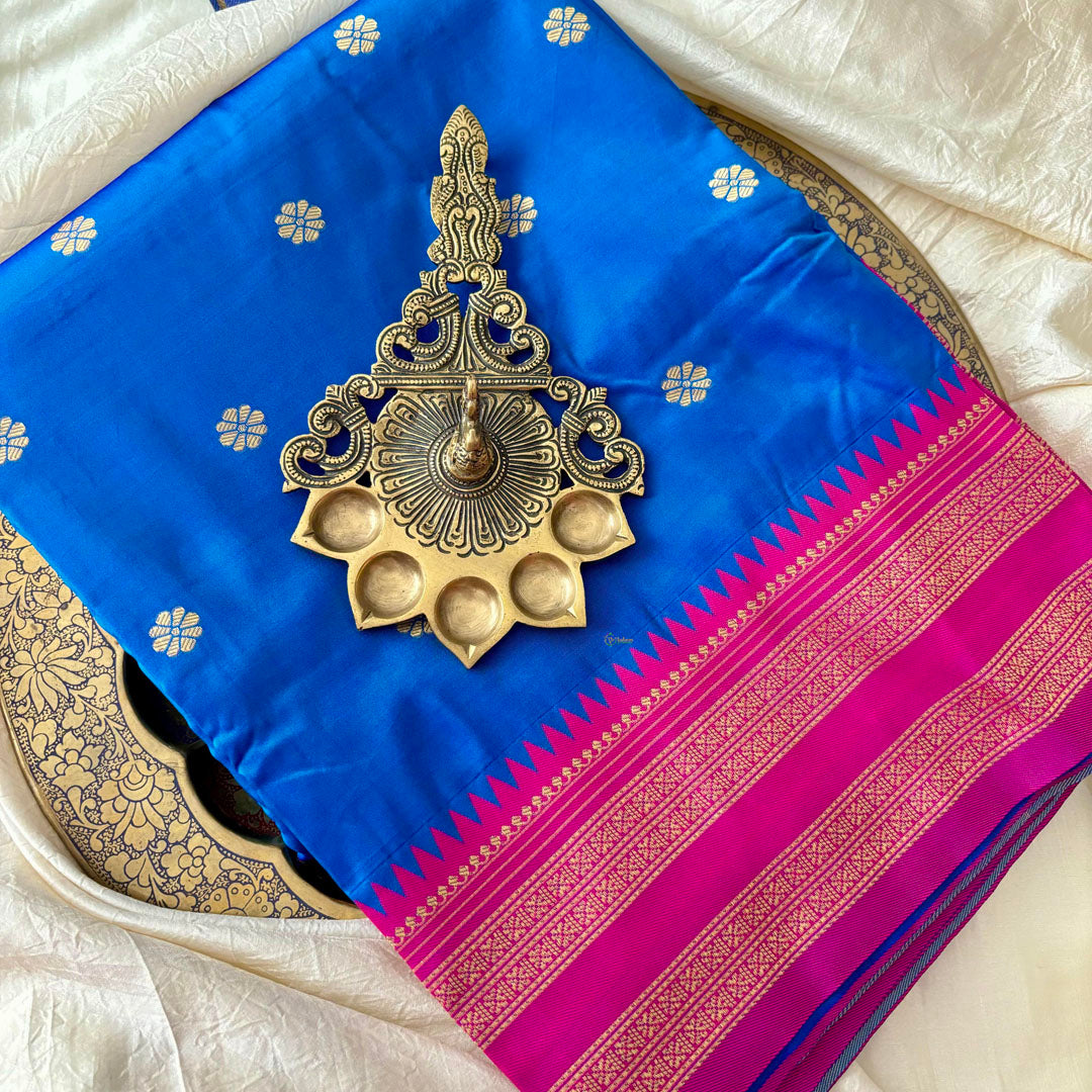 This stunning Morpakhiya saree is sure to make a statement with its magenta pink border and intricate double golden thread work with butta all over saree. Made from luxurious paithani semi silk, this saree is perfect for any occasion, giving you a touch of elegance and style.