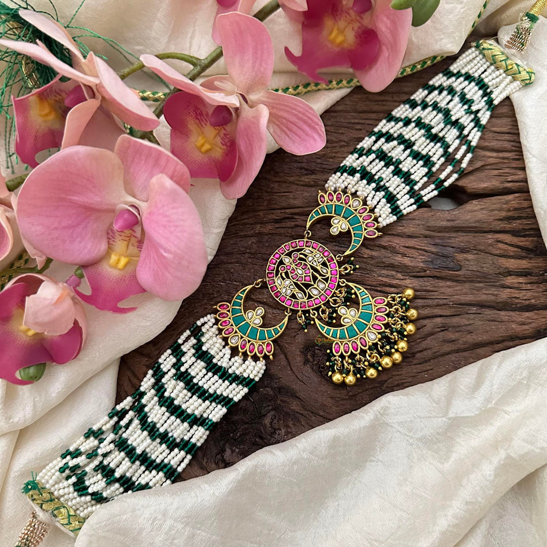 Elevate your style with our Multilayer Jadau Kundan High Neck Choker. This exquisite piece features stunning pearl and green bead detail, adding a touch of elegance to any outfit. Its multilayer design adds dimension and depth, making it a statement piece perfect for any occasion. Dress to impress with J2201!