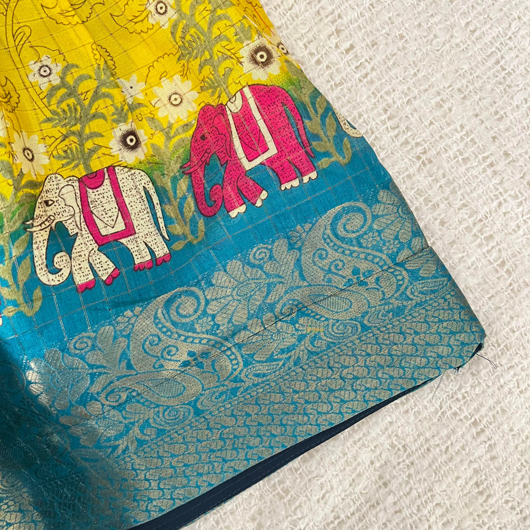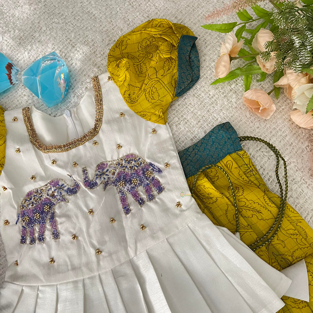 Indulge your little princess in the opulent luxury of our Mustard & White Colour Embroidered Girls Lehenga Set. The white embroidered puffed sleeve top exudes elegance, while the mustard printed skirt, adorned with a striking torquiose border, adds a touch of sophistication. Make her feel like royalty with this exclusive ensemble.