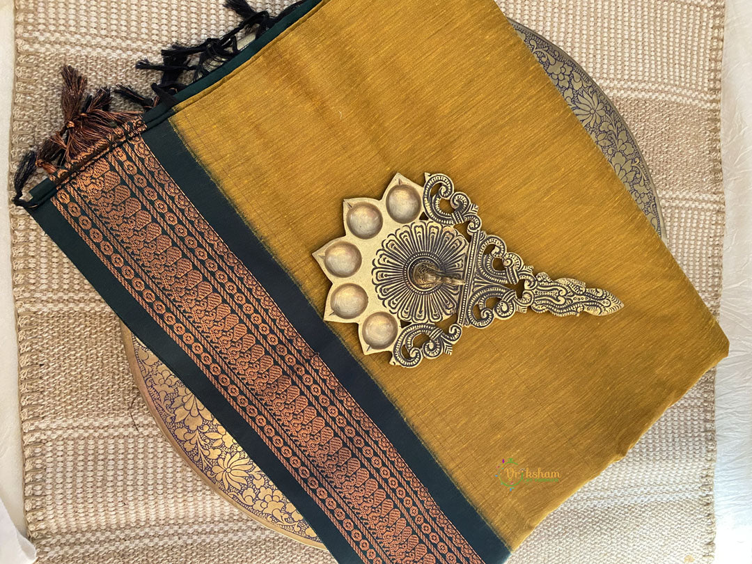 Mustard With Dark Green Border -Kalyani Cotton Saree -These sarees are highly comfort, versatility, and timeless appeal, making them a popular choice for both casual and formal occasions. Whether worn during festive celebrations, weddings, or everyday wear, Kalyani Cotton Sarees exude grace and sophistication, embodying the essence of Indian tradition and craftsmanship - comes with Blouse attached. Contrast border saree. Poly mix cotton.