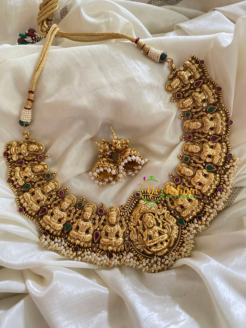 Nakshi Choker -Lakshmi Choker -Nagas Collection -Red Green stone studded–temple neckpiece with linear arrangement of lakshmi idols, comes with matching jhumkas. Cluster Pearl finish.