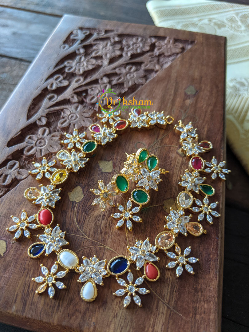 Navarathna AD Stone Neckpiece – Navarathna like stone studded with AD stone flower interludes and pendant like pattern. Comes with matching ear studs.
