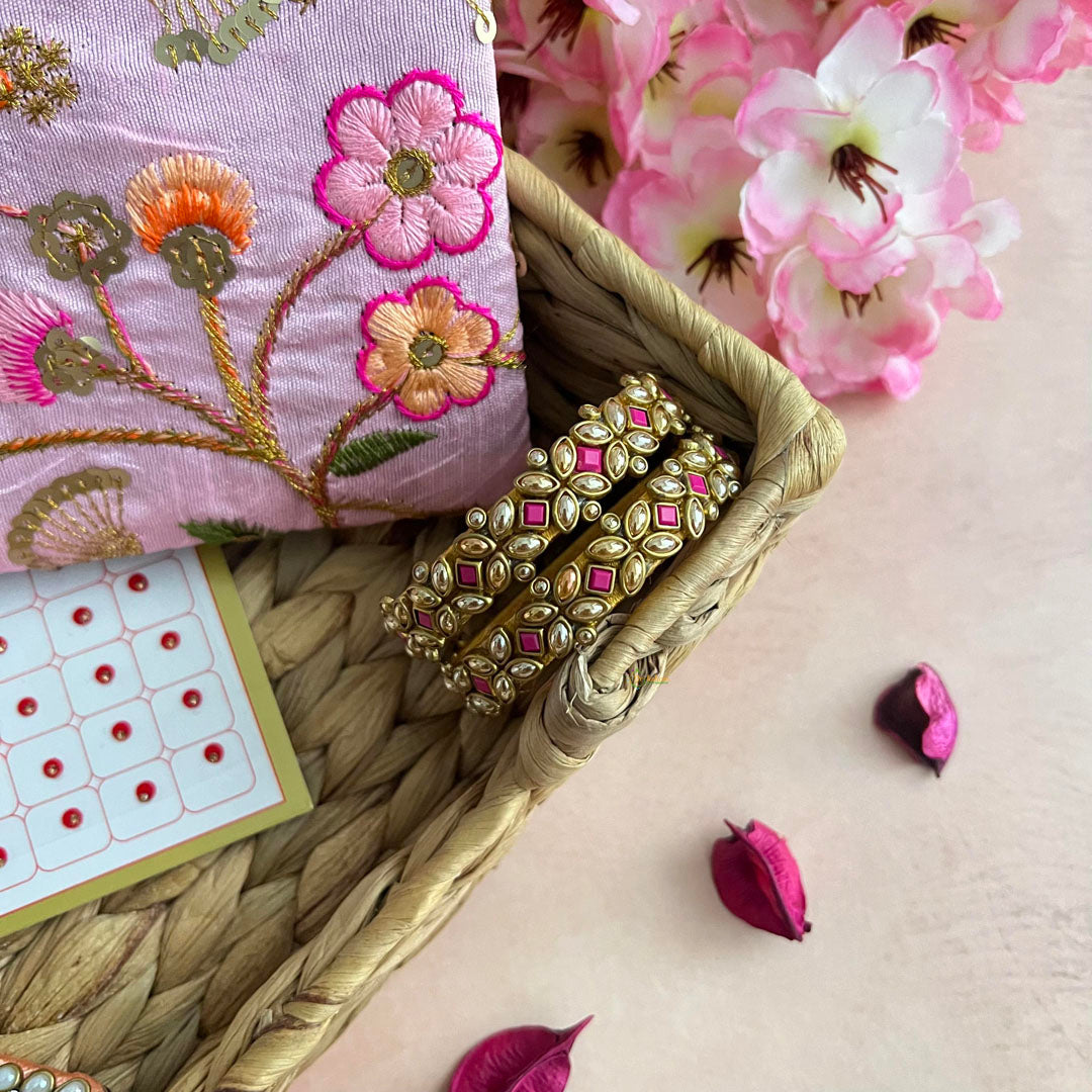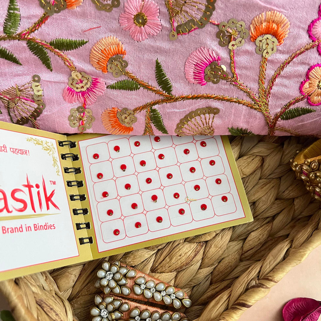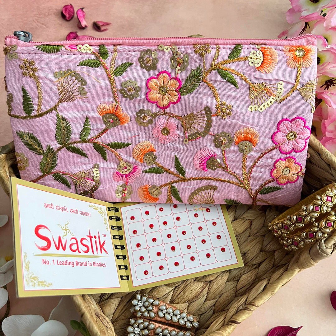 Celebrate Navratri with our exclusive Kanya Hamper, perfect for the stylish and sophisticated woman. This luxurious gift set includes a stunning purse, a bindi book for intricate designs, a pair of elegant kundan hair clips, and a pair of silk thread bangles. Elevate your Navratri festivities with this premium gift. Basket is not included.