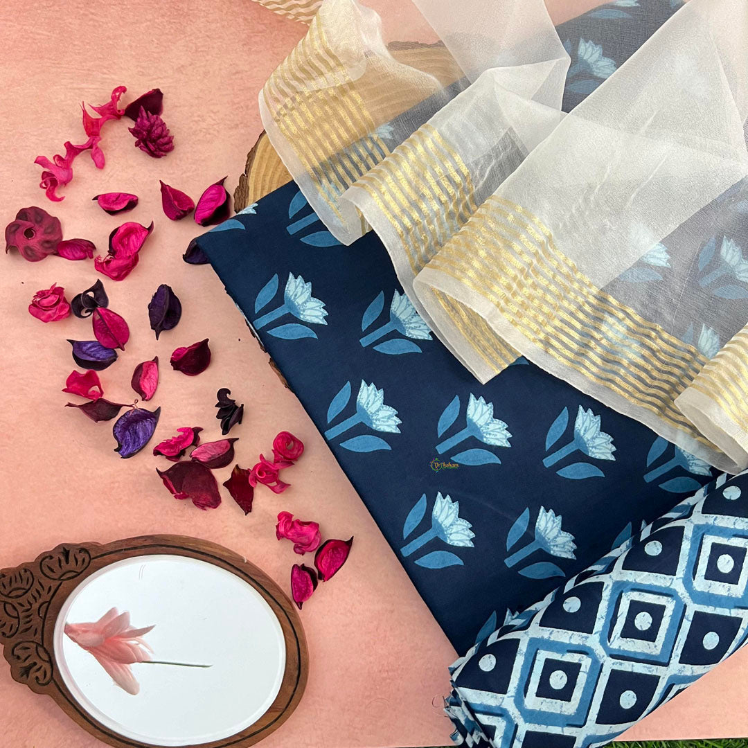 This Navy Blue Color Cotton Suit Material Set is perfect for adding a touch of elegance to any outfit. The Bagru print on the bottom and organza printed dupatta adds a unique touch to this set. Made from high-quality cotton, this set is comfortable and stylish. Elevate your wardrobe with this versatile and chic suit material set!