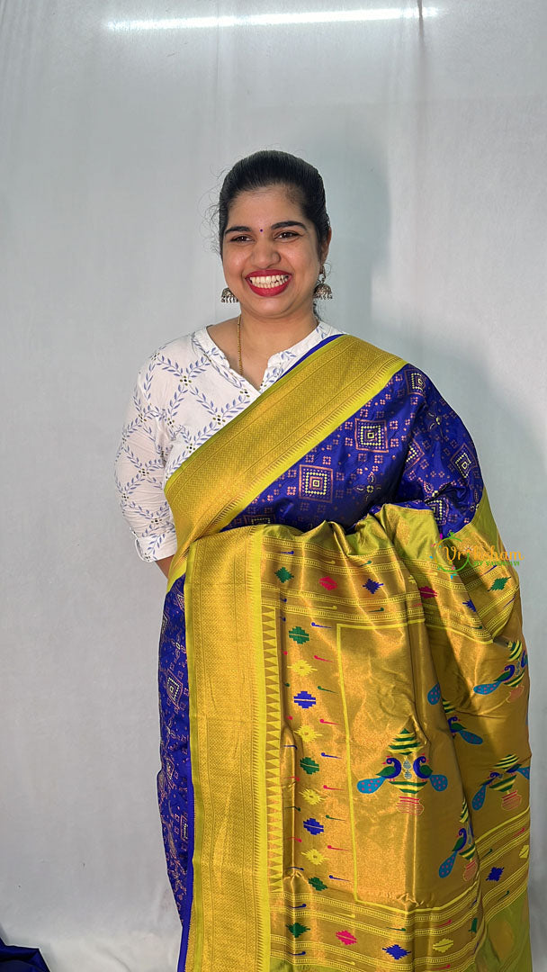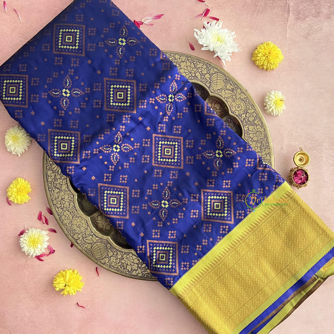 Elevate your style with our Navy Blue with Light Green Bandhani Semi Soft Silk Paithani Saree. Made from luxurious bandhani silk, this saree is a perfect blend of traditional and contemporary design.