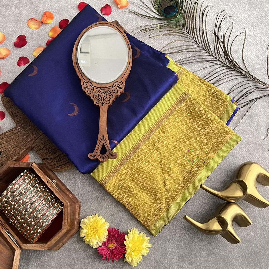 Elevate your elegance with our Navy Blue With Light Green Border Chandrakor Tana Katan Silk Paithani Saree. Made with luxurious silk, this saree features a unique nath pallu, adding a touch of sophistication to your style. Wrap yourself in comfort and grace with this exclusive piece.