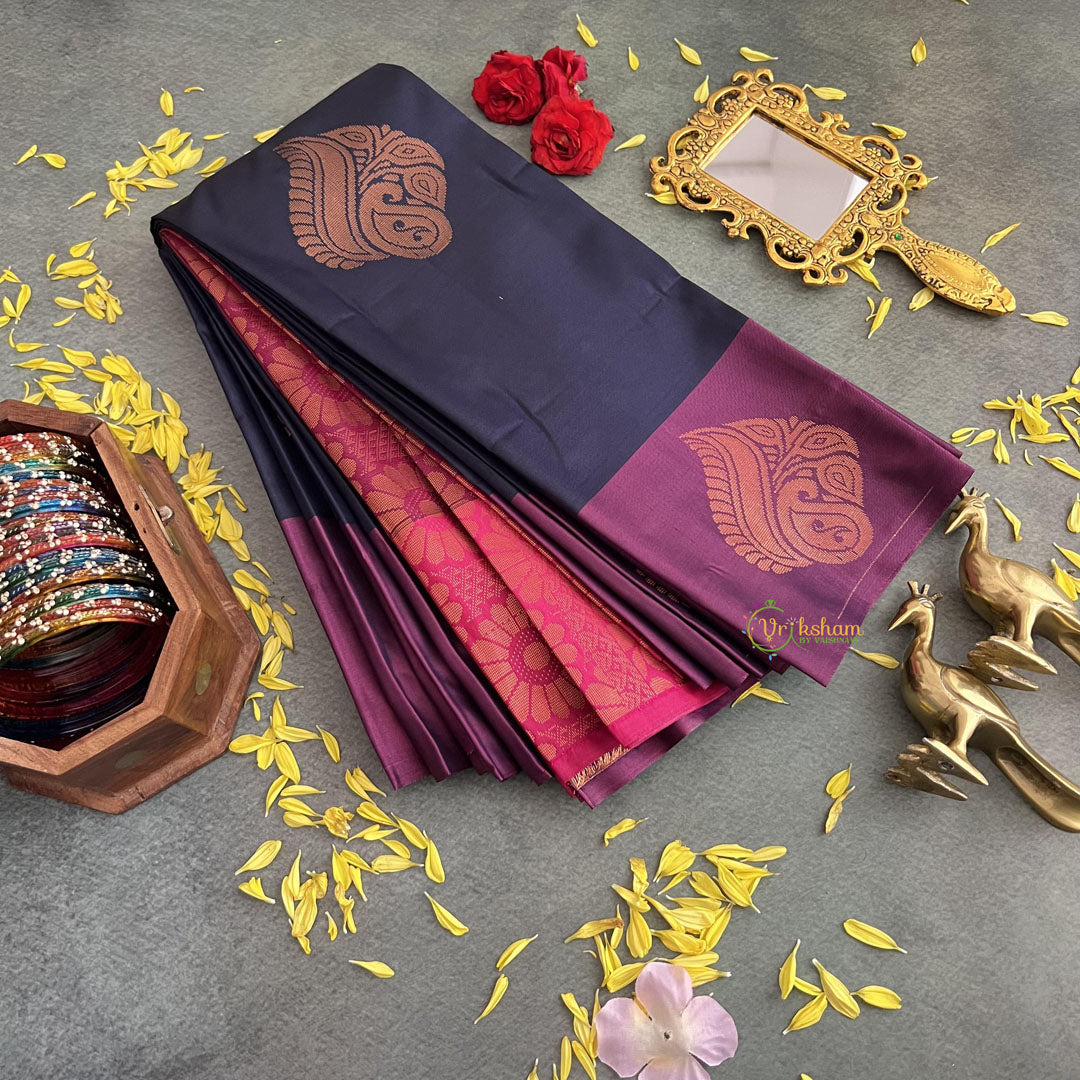 Experience the indulgence of our Navy Blue Color Semi Soft Silk Saree. Adorned with a self-design border in rich wine color, this saree exudes elegance and sophistication. The intricate butta work adds a touch of luxury to your look. Elevate your style with this exclusive piece.