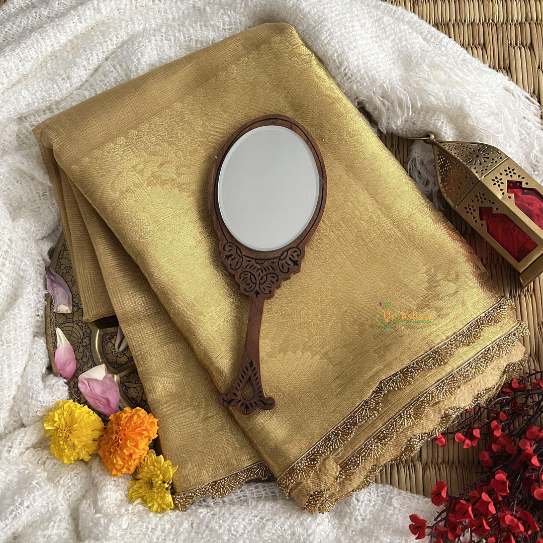 Elevate your style in this exquisite Janhvi Kapoor Golden Organza Saree. This handloom masterpiece drapes elegantly, accentuating your curves with its luxurious texture and delicate detailing. Experience the allure of this saree as it adds a touch of sophistication and exclusivity to your wardrobe.