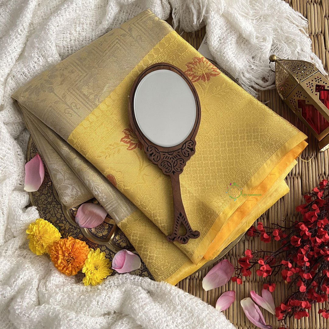 Indulge in luxury with our Golden Banarasi Saree. Handloomed with intricate details, this premium saree exudes elegance and sophistication. Elevate your wardrobe with this exclusive piece, perfect for any occasion.