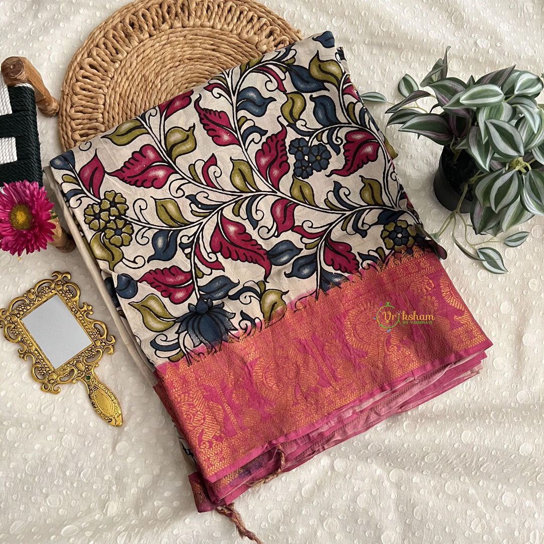 Indulge in luxury with our Off White Kalamkari Saree. Made from the finest Kalamkari chiniya silk, this saree exudes elegance. Adorned with a beautiful Nizam border, it adds a touch of sophistication to your look. Elevate your style with this exclusive piece.