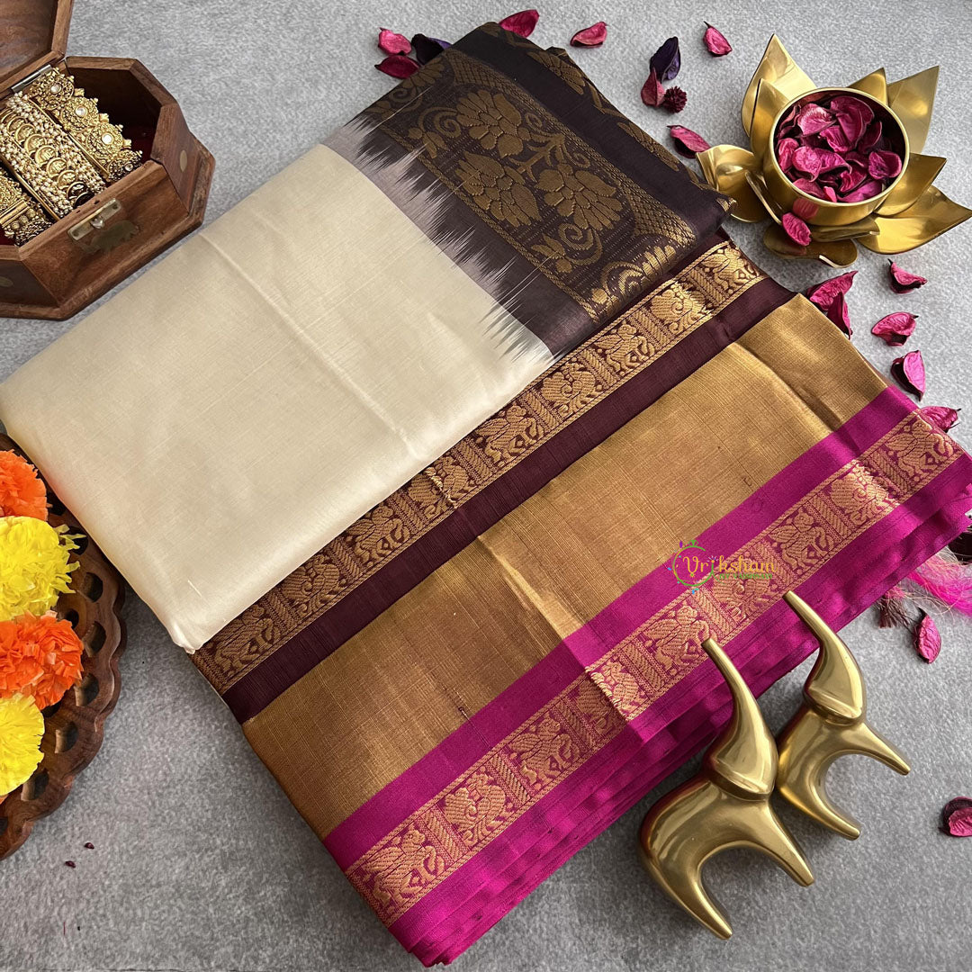 Elevate your style with our Handloom Off White Silk Cotton Saree. Adorned with intricate golden zari work on the Ganga Jamuna border, this saree exudes luxury and elegance. Perfect for special occasions, experience the finest craftsmanship and rich cultural heritage with each wear.