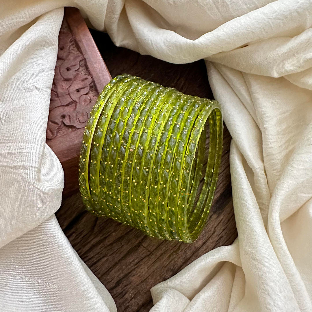 Olive Green Rain Drop Thin Glass Bangle-Set of 12- G13638