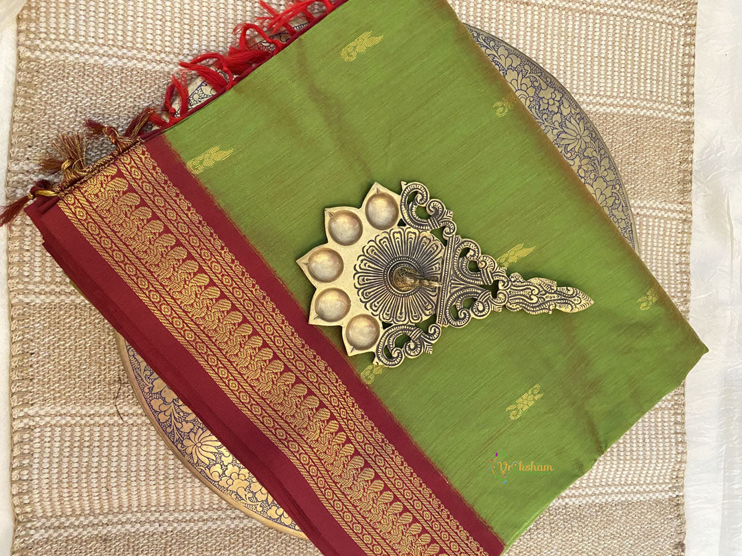 Green With Red Border -Kalyani Cotton Saree -These sarees are highly comfort, versatility, and timeless appeal, making them a popular choice for both casual and formal occasions. Whether worn during festive celebrations, weddings, or everyday wear, Kalyani Cotton Sarees exude grace and sophistication, embodying the essence of Indian tradition and craftsmanship - comes with Blouse attached. Contrast border saree. Poly mix cotton.