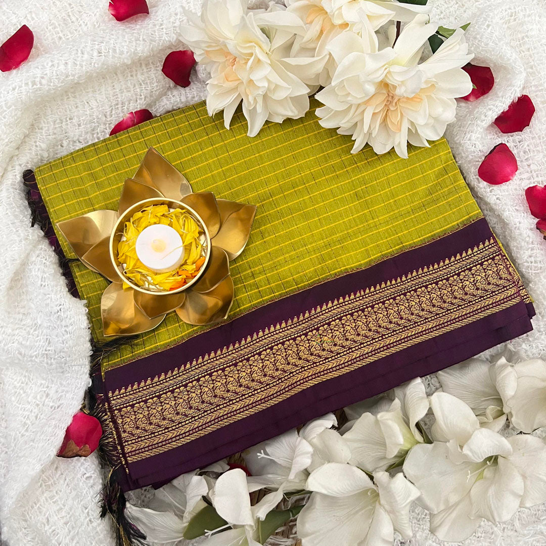 Elevate your traditional wardrobe with our stunning Firosa With Black Border-Vairaoosi Podi Kattam Kalyani Cotton Saree. Made from high-quality Kalyani cotton, this saree features a contrast border and intricate zari work, adding elegance to your look. The Vairaoosi Podi Kattam means small checks, add a unique touch to this saree, making it a must-have for any occasion!