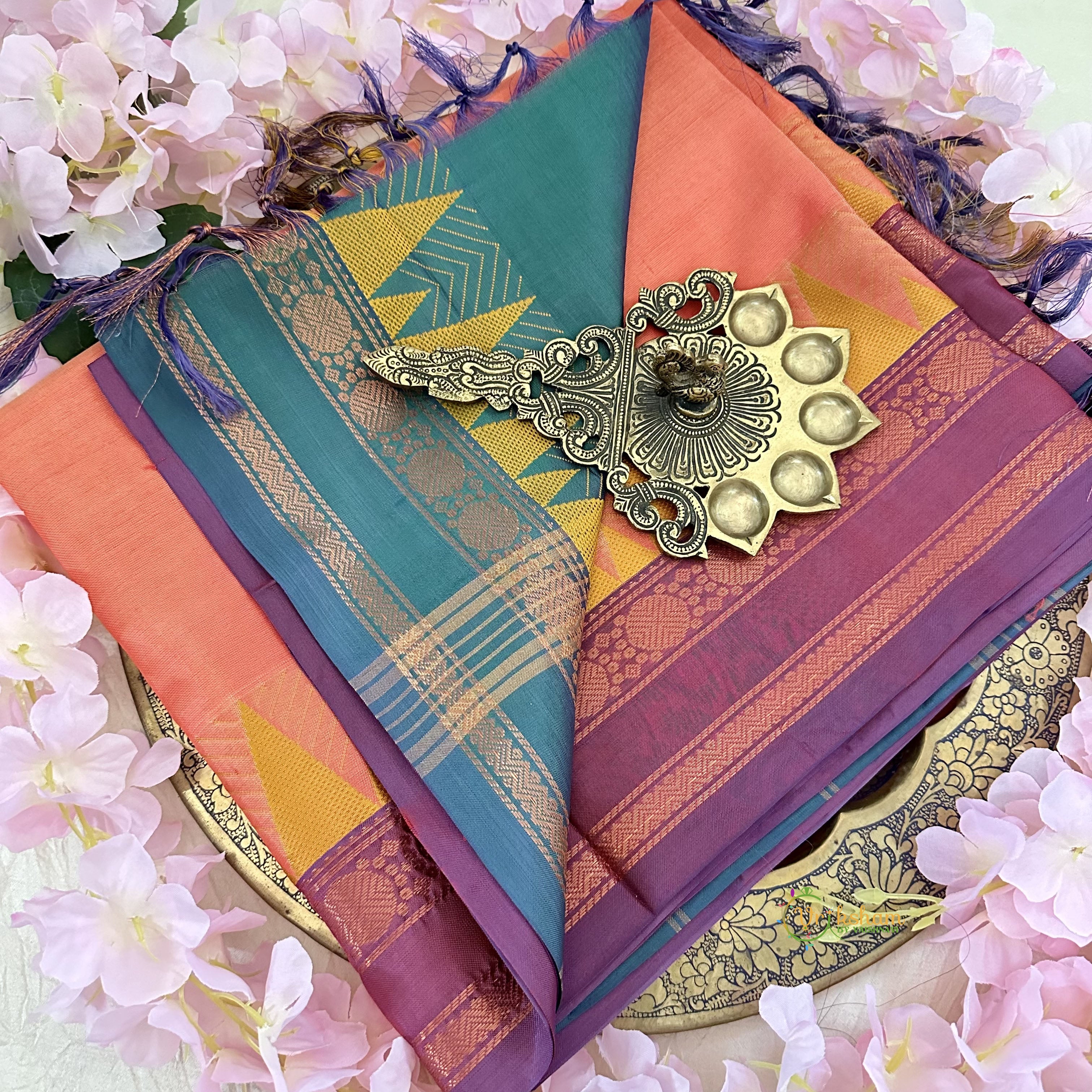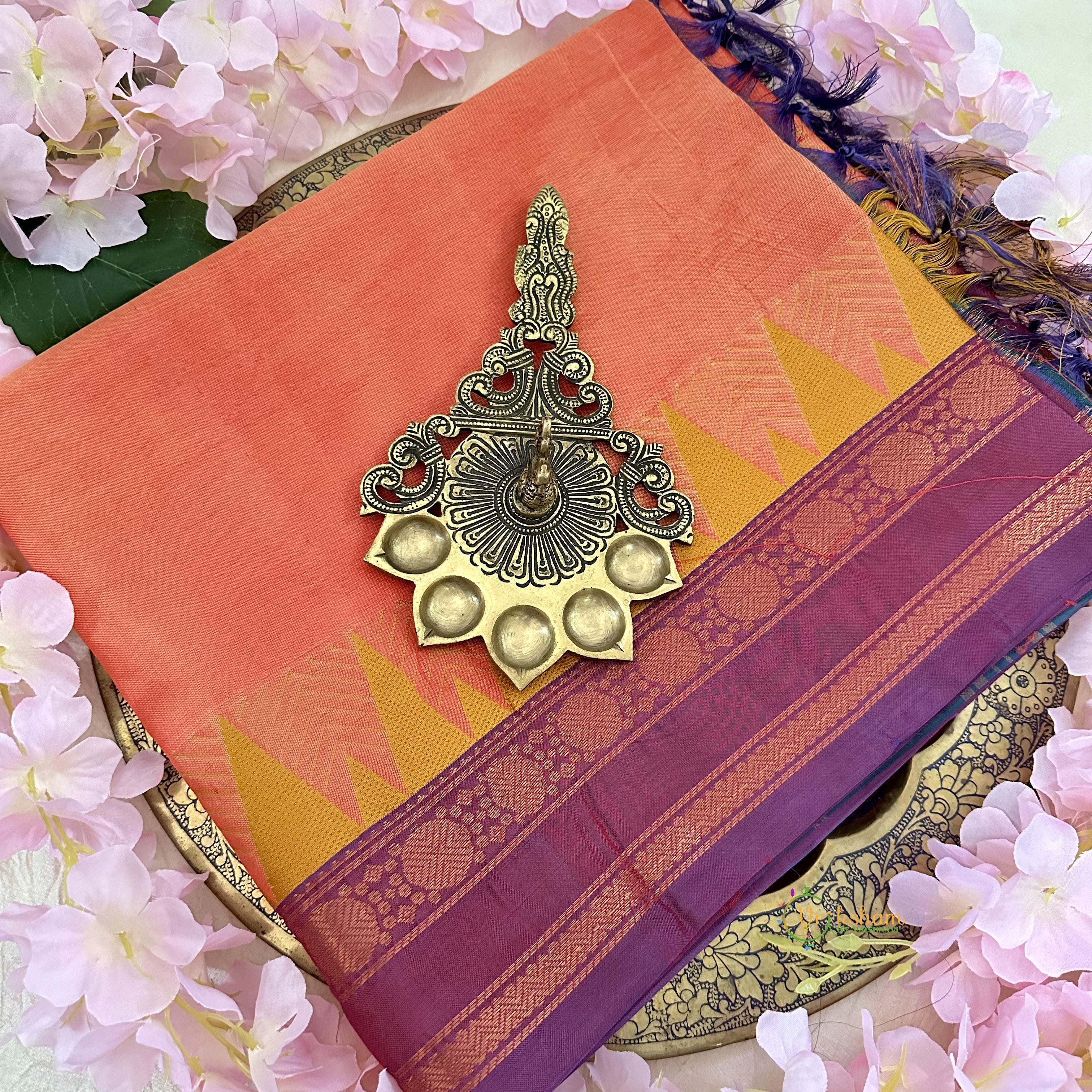 Orange Chinnalampattu Saree Double Copper and Temple Border with Peacock colour Pallu - Chinnalampattu sarees are typically handwoven using pure silk threads. The unique feature of these sarees lies in their border designs, which often include intricate patterns inspired by nature, temples, and traditional motifs. The pallu (the loose end of the saree) is also elaborately designed, adding to its elegance. Doesn't come with blouse -Saree only.