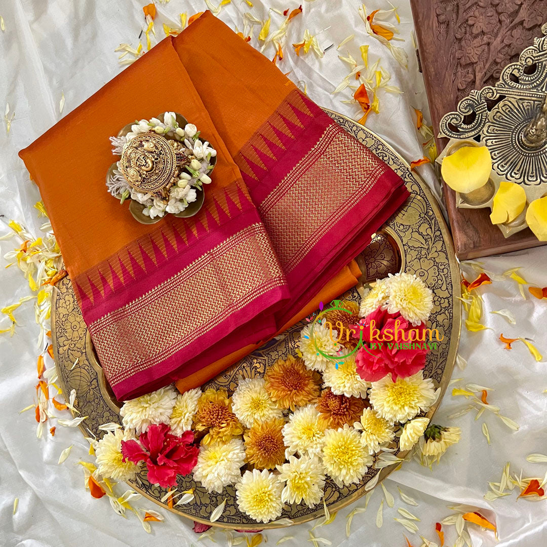 Orange Temple Border Silk Saree with Pink border - Kanchi Silk Saree – Festive wear silk saree – saree; comes with Blouse attached. Power loomed saree.