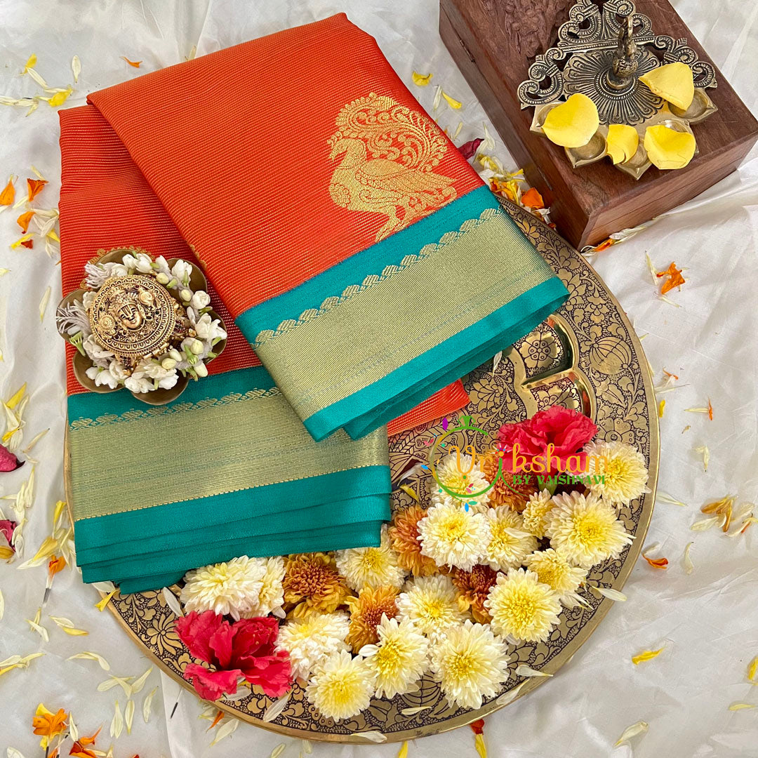 Orange Vairaoosi Silk Saree with Turquoise Border - Kanchi Silk Saree – Festive wear silk saree – saree; comes with Blouse attached. Power loomed saree.