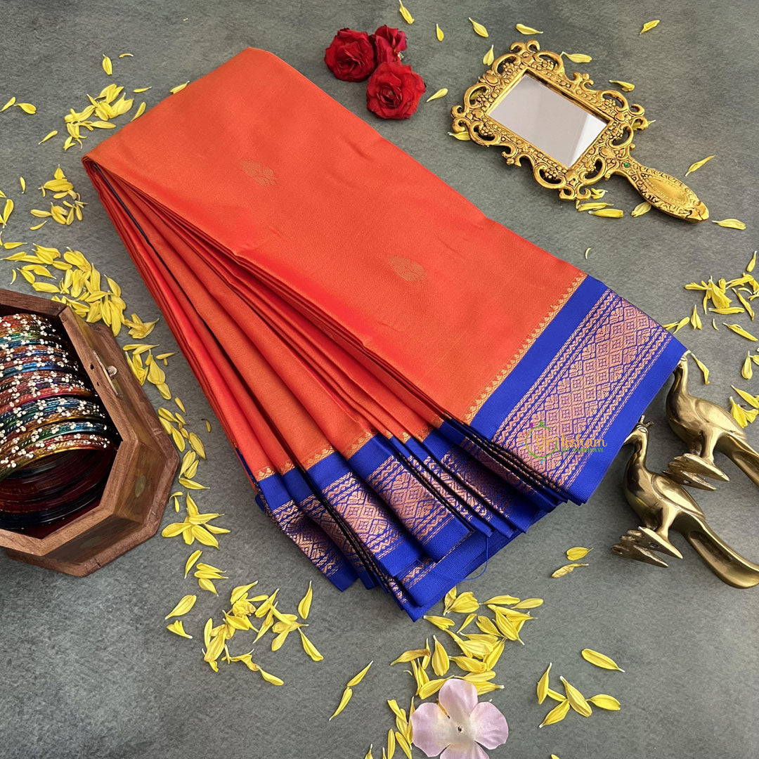 Orange with Blue Border Semi Soft Silk Saree- with traditional border –Small Butta Pattern throughout the saree; comes with Blouse attached. Two side same size contrast border.
