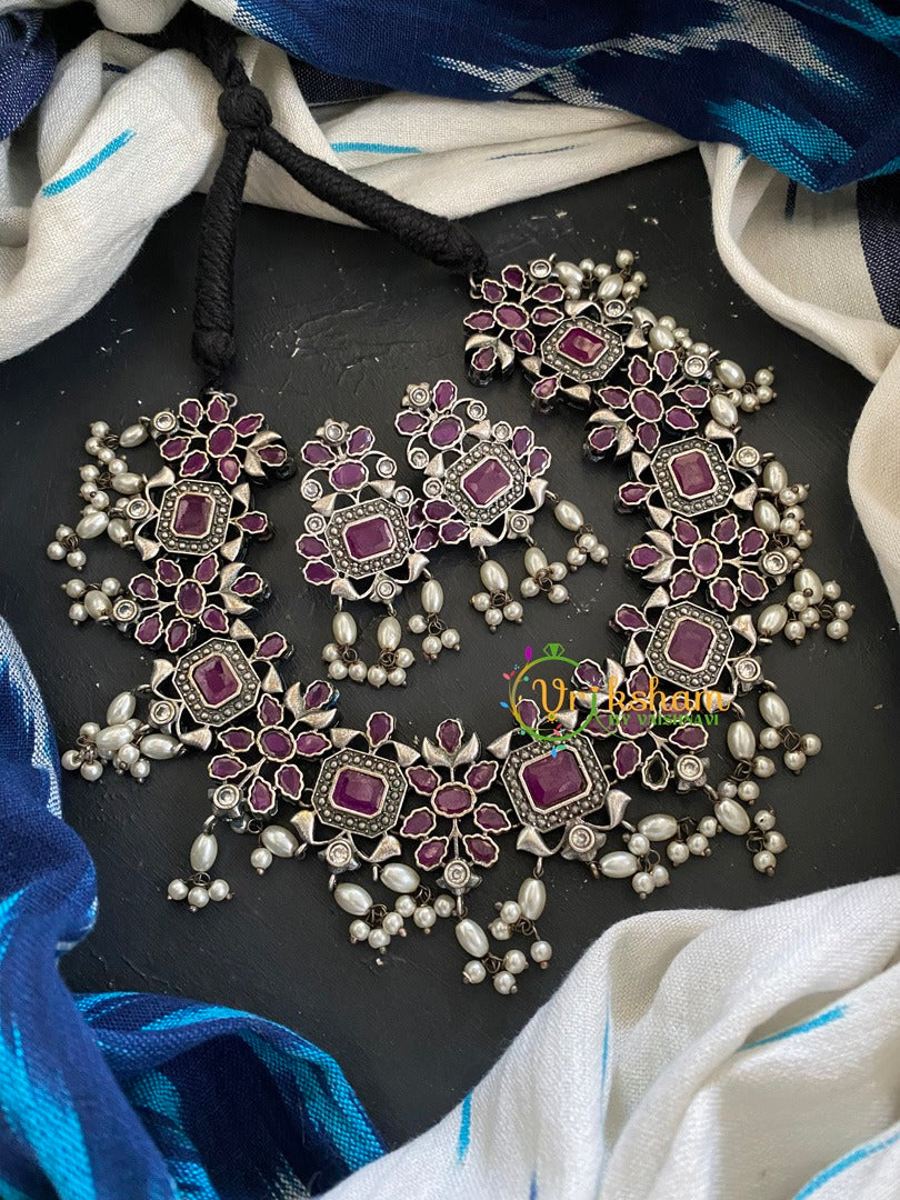 Oxidized Silver Guttapusalu Neckpiece -Red stone studded -Short neckpiece with rice pearl cluster pearl Guttapusalu finish in black rope, comes with matching earrings.