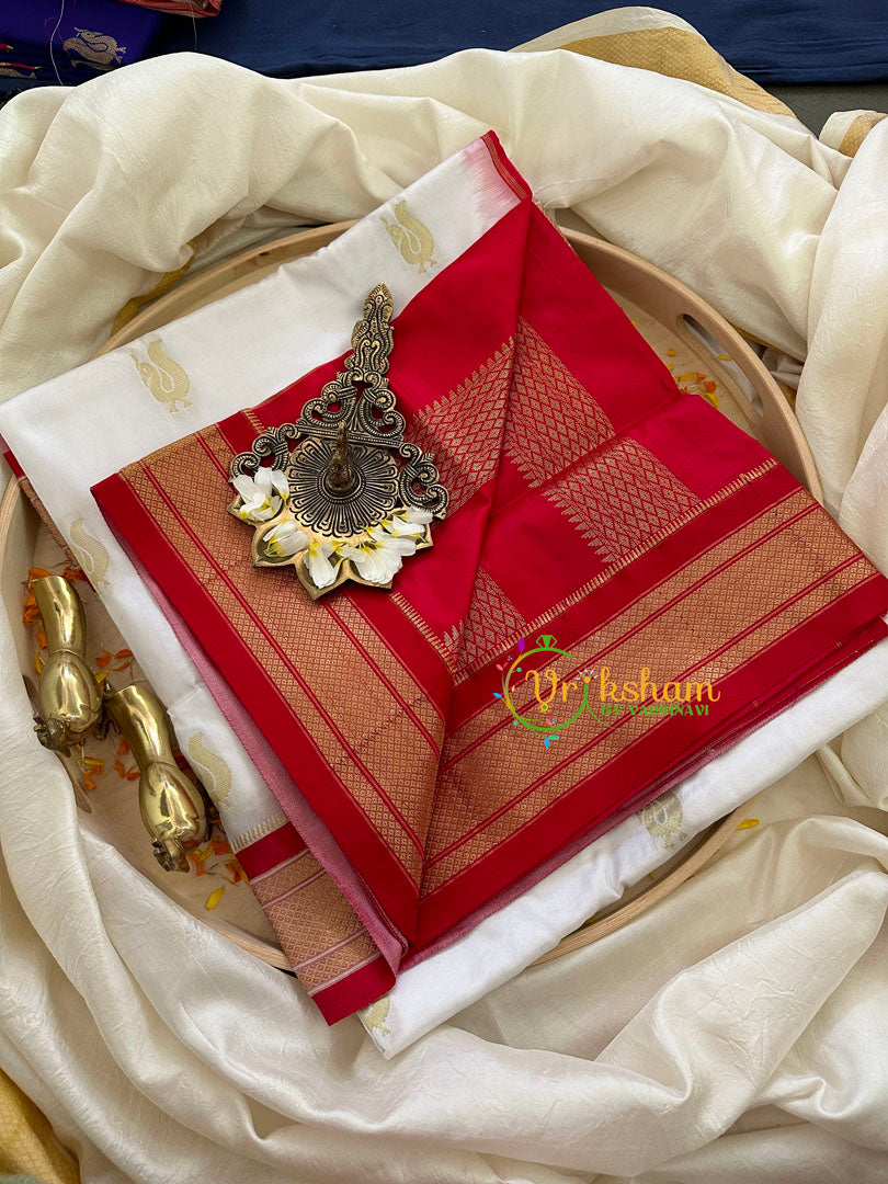 White with Red Paithani Pure Silk Saree – Comes with SILK MARK - Festive wear saree –Paithani Mayil Butta work throughout the saree; comes with Blouse attached. Traditional contrast border and pallu.