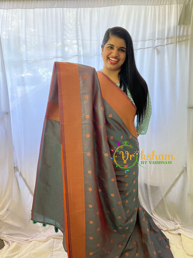 Grey Paithani Semi Soft Silk Saree – Festive wear saree –Paithani Butta work throughout the saree; comes with Blouse attached. Copper Thread work. Two side zari border with Meenakari Pallu.