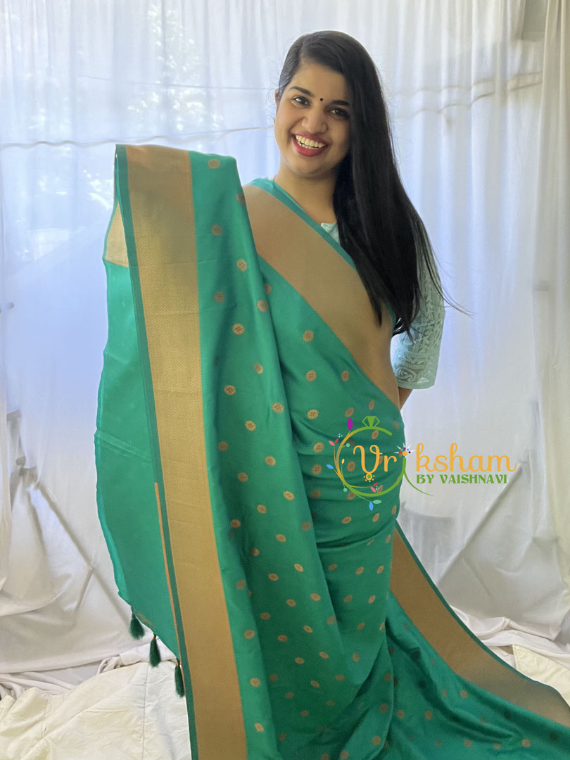 Light Mint Green Paithani Semi Soft Silk Saree – Festive wear saree –Paithani Butta work throughout the saree; comes with Blouse attached. Copper Thread work. Two side zari border with Meenakari Pallu.