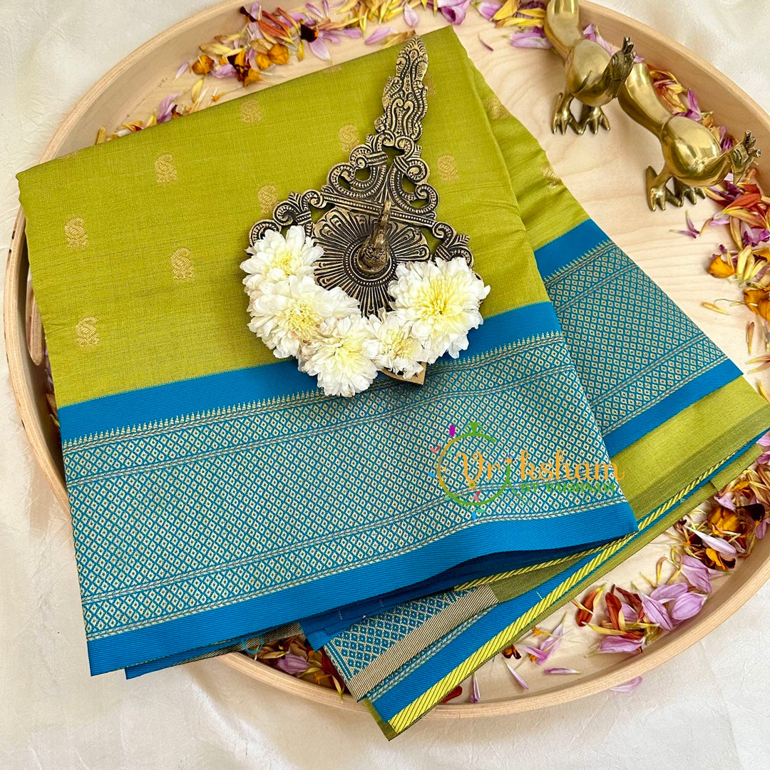 Light Green Paithani Soft Silk Saree – Festive wear saree –Paithani Butta work throughout the saree; comes with Blouse attached. It is a soft silk paithani weave Pallu is hand woven. Contrast border and pallu.