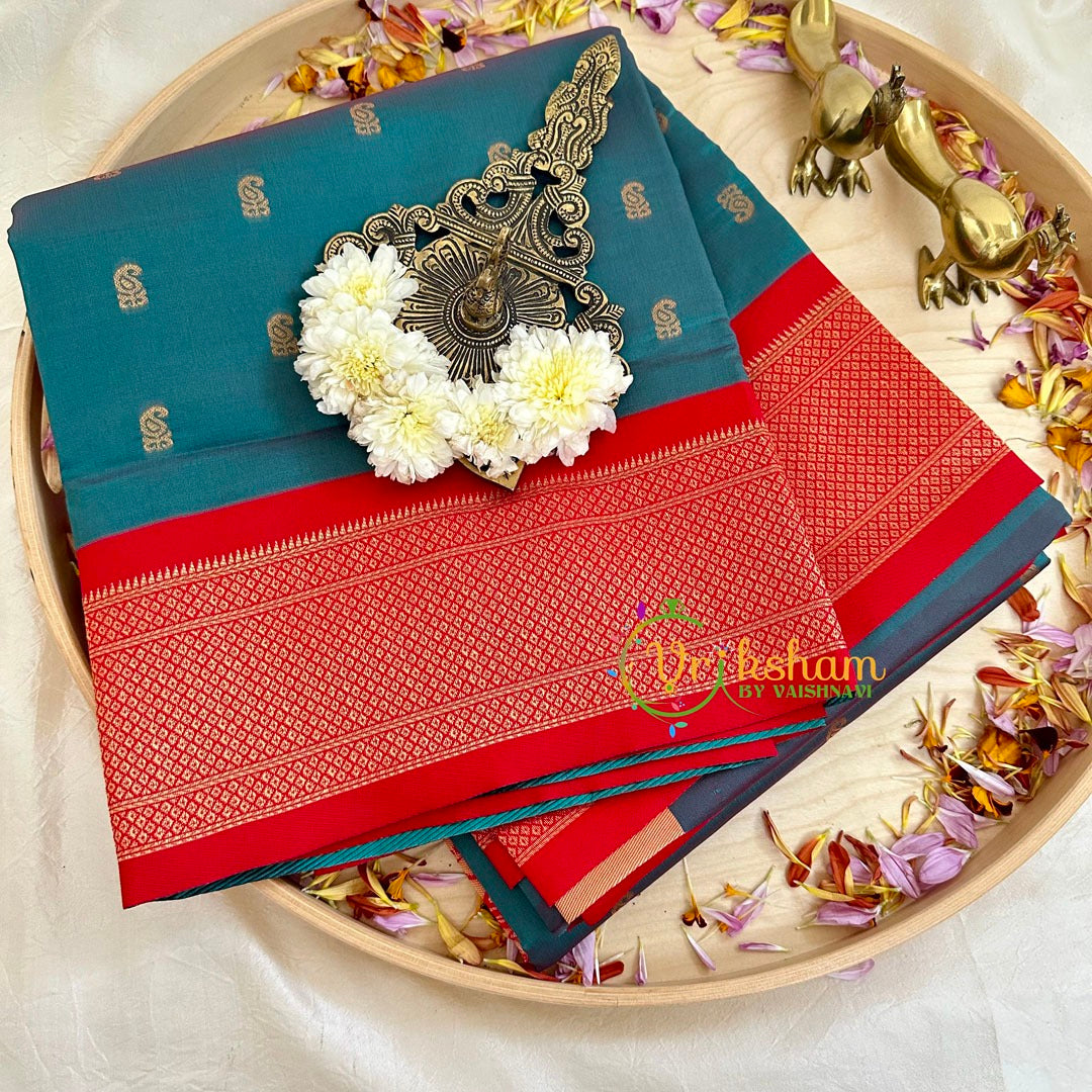 Peacock Blue Paithani Soft Silk Saree – Festive wear saree –Paithani Butta work throughout the saree; comes with Blouse attached. It is a soft silk paithani weave Pallu is hand woven. Contrast border and pallu.