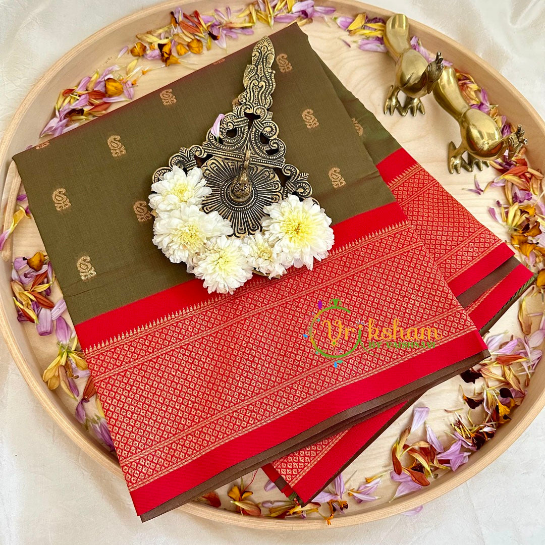 OlivePaithani Soft Silk Saree – Festive wear saree –Paithani Butta work throughout the saree; comes with Blouse attached. It is a soft silk paithani weave Pallu is hand woven. Contrast border and pallu.