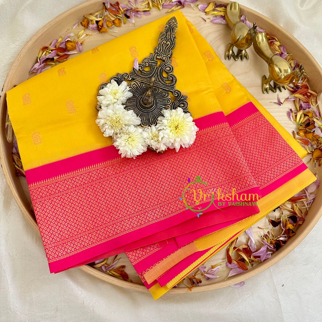 Yellow with Pink Paithani Soft Silk Saree – Festive wear saree –Paithani Butta work throughout the saree; comes with Blouse attached. It is a soft silk paithani weave Pallu is hand woven. Contrast border and pallu.
