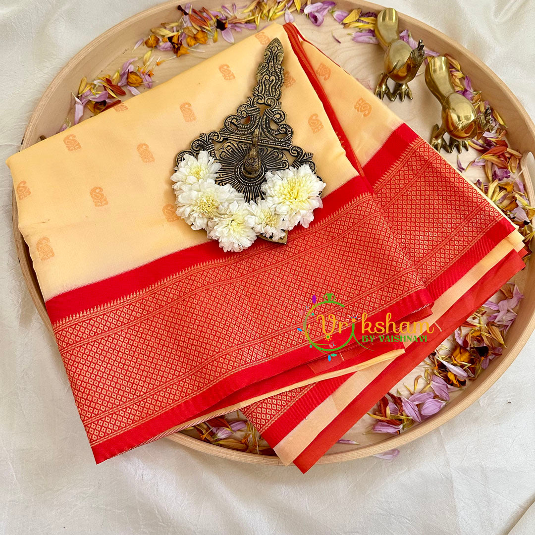 Sandal with Red Paithani Soft Silk Saree – Festive wear saree –Paithani Butta work throughout the saree; comes with Blouse attached. It is a soft silk paithani weave Pallu is hand woven. Contrast border and pallu.