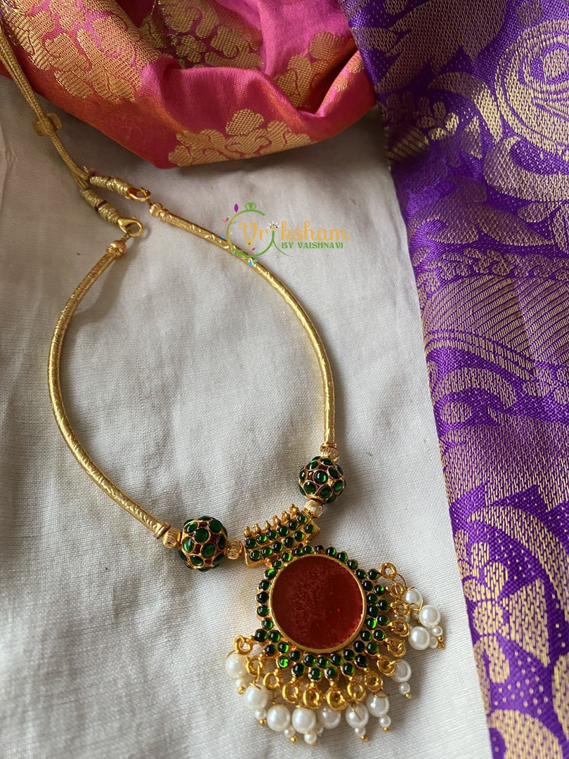 Palakka Pendant Kemp choker, Red Green kemp imitations stone studded pendant with rudraksh sides choker neckpiece.