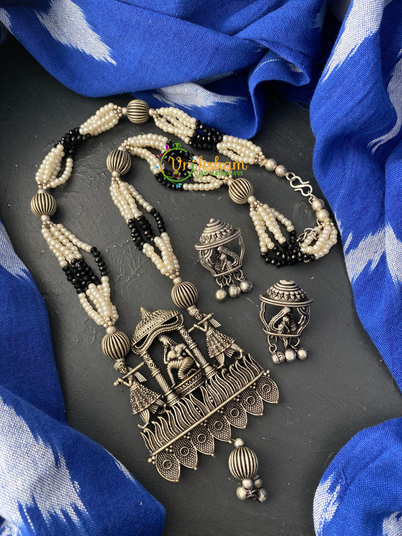Palanquin Silver Look Alike Pendant Neckpiece-WHITE - Palanquin pendant with silver and black bead mangalsutra type neckpiece, comes with ear studs.
