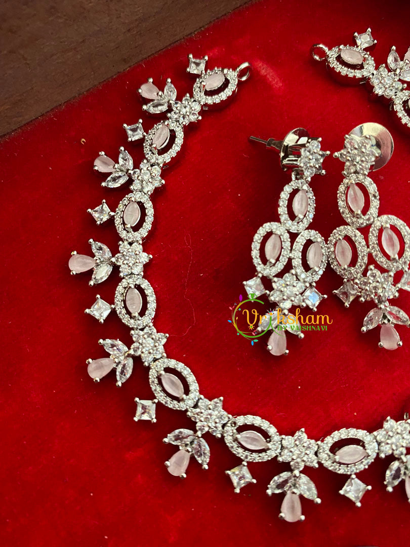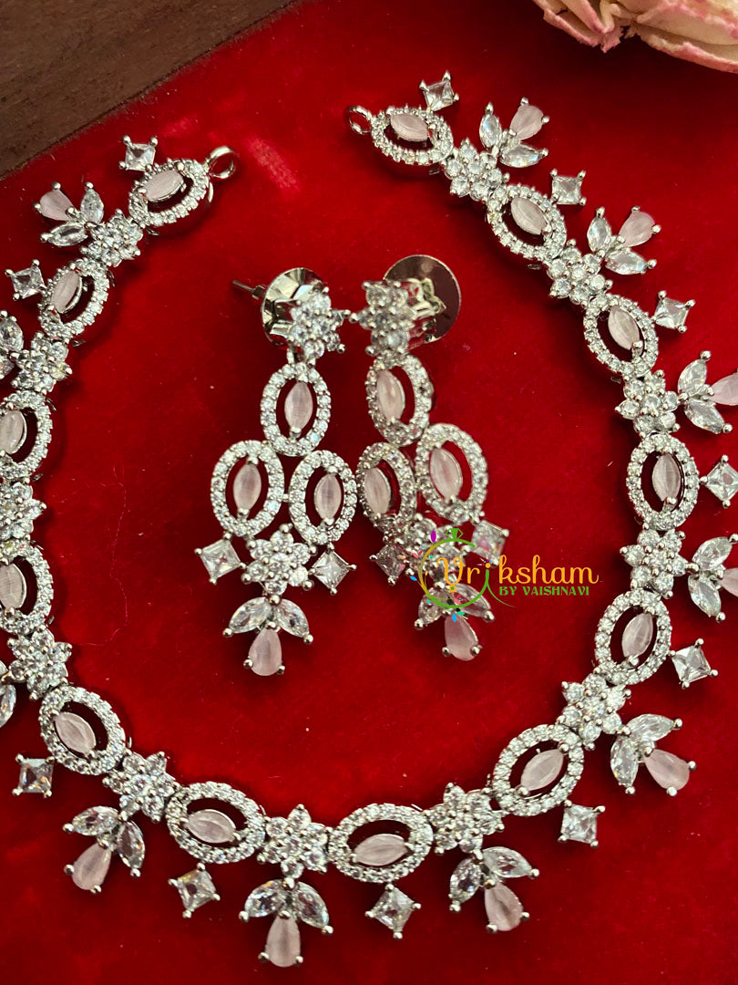 White Tone Pastel American Diamond Choker- Floral leaves and Tear Drops–WHITE TONE imitation jewelry set; Comes with a pair of similar danglers.