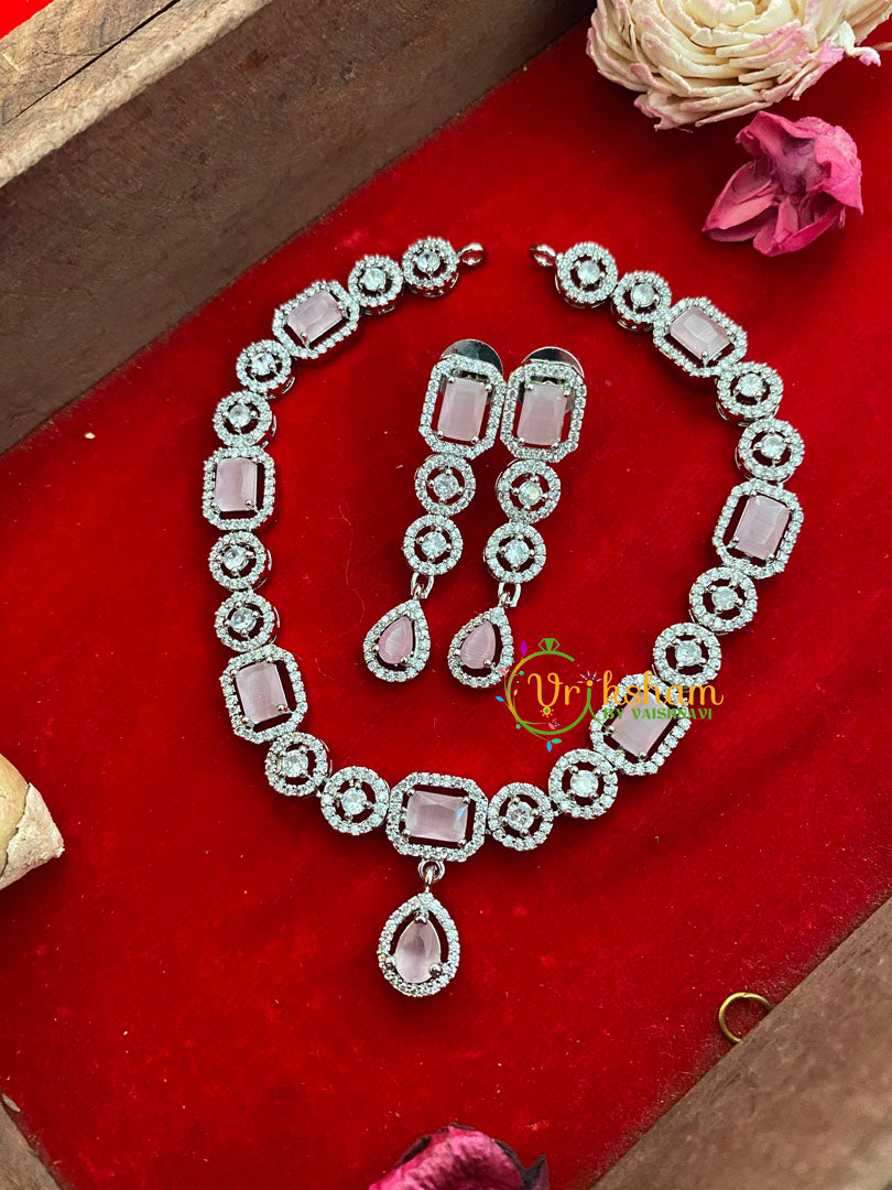 Pastel American Diamond Neckpiece with Tear Drop Pendant–WHITE TONE imitation jewelry set; Comes with a pair of similar danglers.