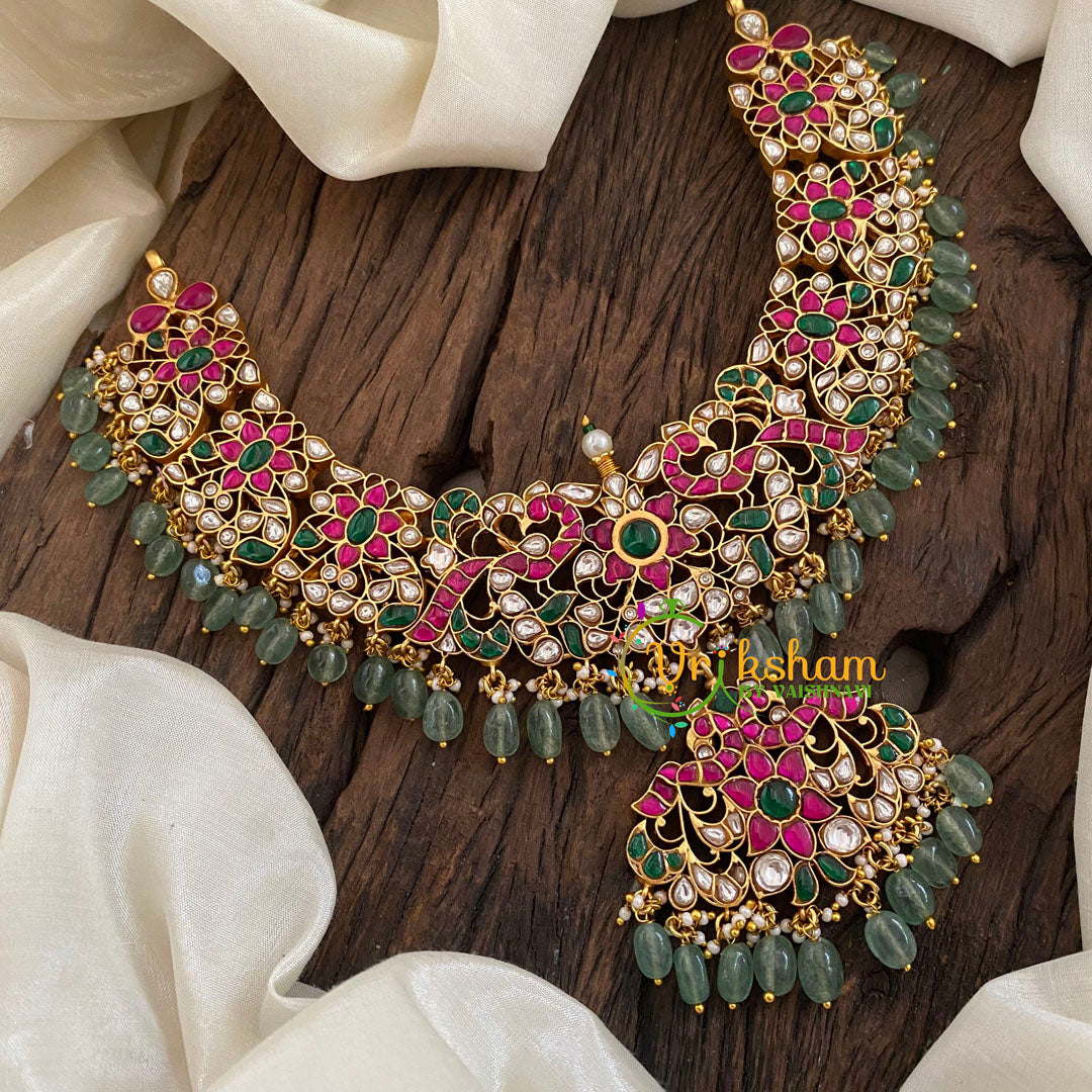 Pastel Green Jadau Kundan Choker Short Neckpiece - semi precious kundan stones with jadau work and pastel green bead finish. Neckpiece only. ~ Consists of  neckpiece with back rope only....