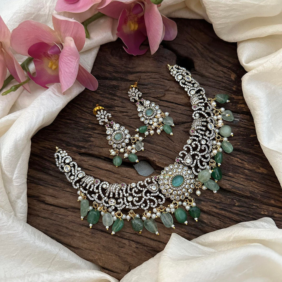 Victorian Diamond High Neck Choker - semi precious stone studded statement royal jewelry; comes with matching earrings.