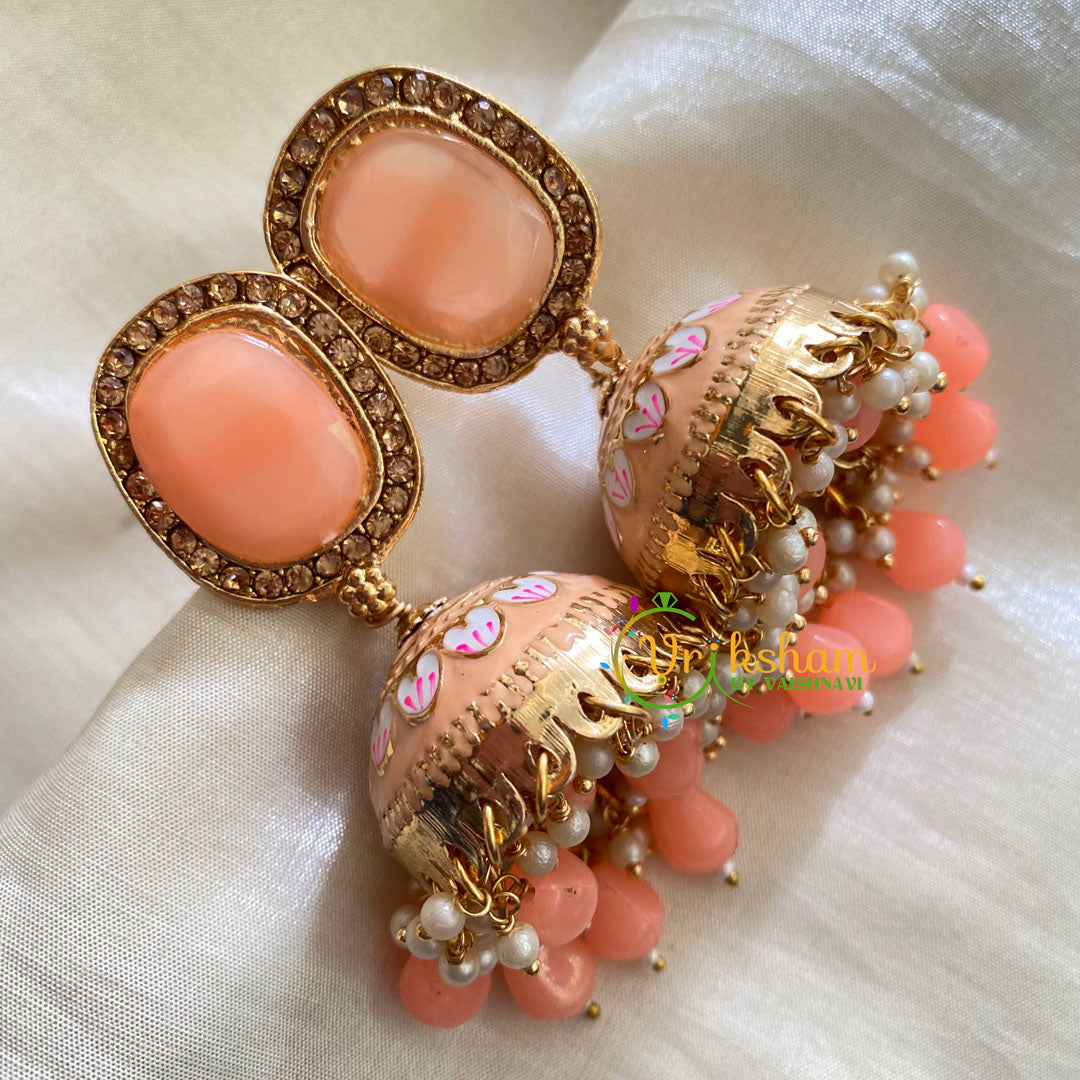 Pastel Orange Meenakari Jhumkas-Hand painted-Oblong Stud with hand painted Jhumkas base. Bead and Pearl finish. Medium size.