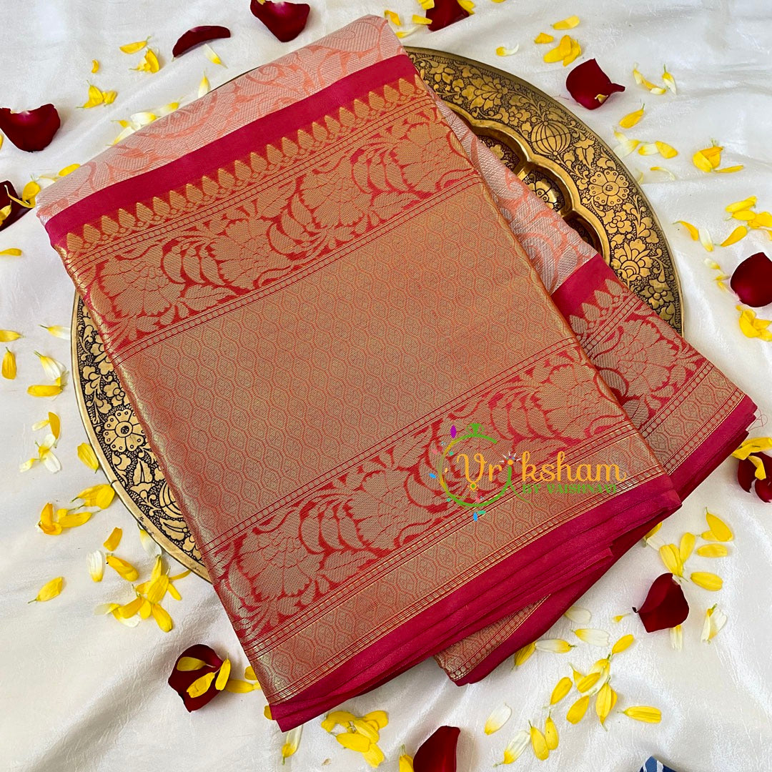 Colour and Material: Pastel Orange Semi Benarasi Saree with red border.