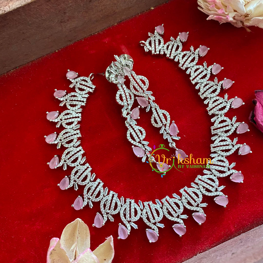 Pastel Pink American Diamond Choker-Tear Drop Neckpiece-set of choker and earring; diamond shaped white stone with pink tear drop neckpiece.