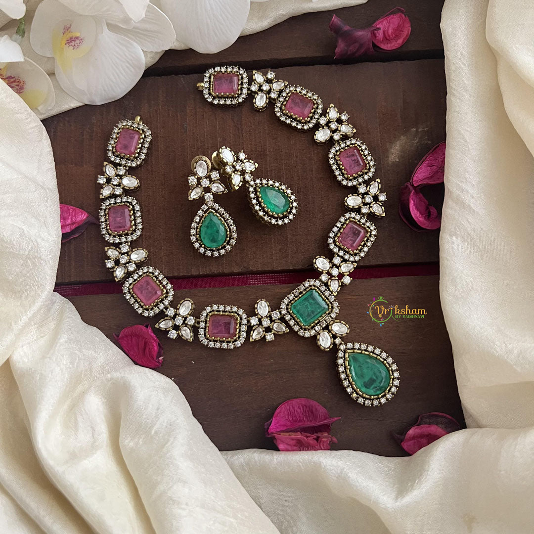 Indulge in elegance with our Pastel Pink & Green Victorian Diamond Short Neckpiece-Tilak. A delicate blend of soft pink and green hues adorned with diamonds, this neckpiece exudes sophistication and exclusivity. Elevate any outfit and make a statement with our Tilak.