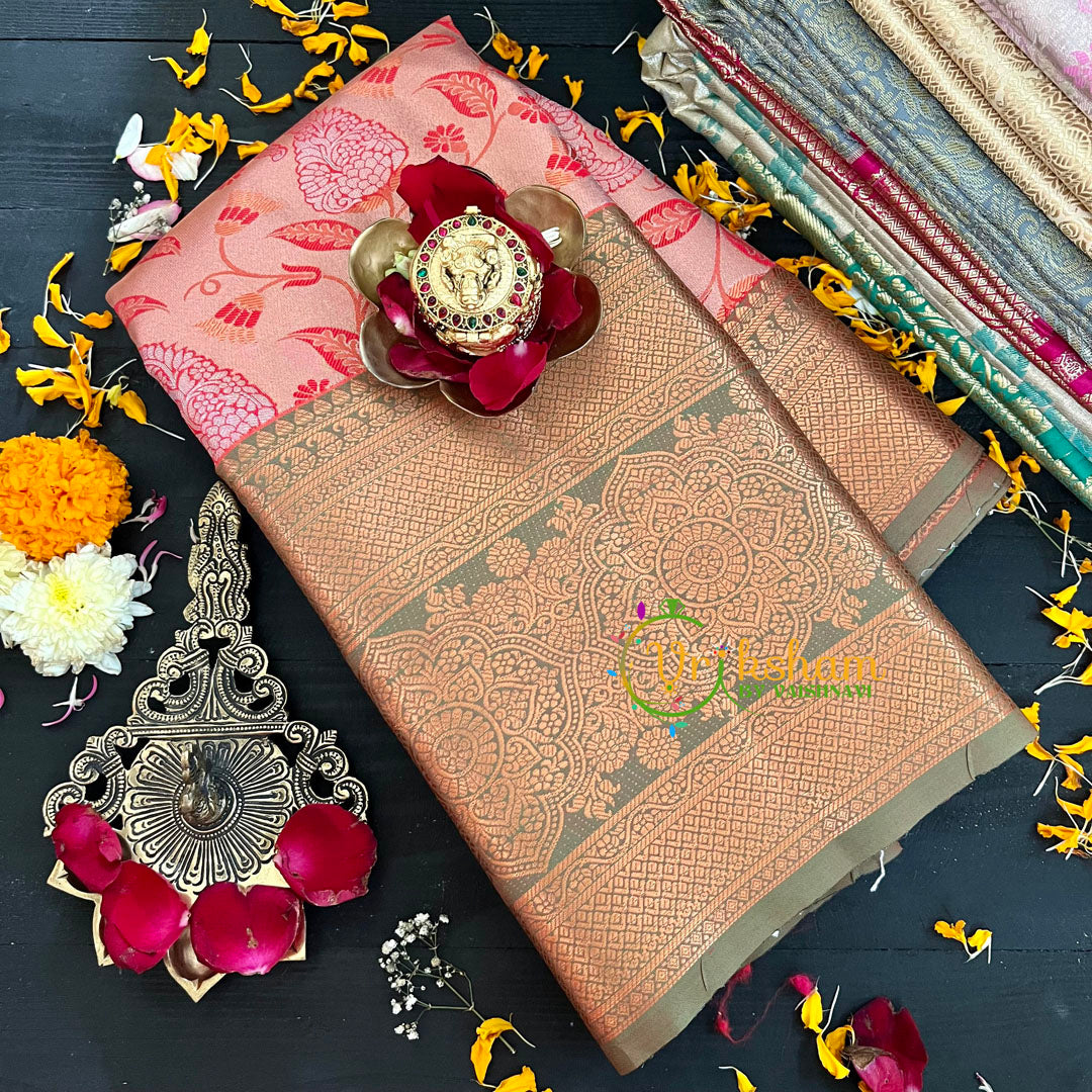 Pastel Pink Silk Saree with Sage Green Border – Festive wear saree – Pattern throughout the saree; comes with Blouse attached. One side Big Border and other side lean border. Power loomed saree.