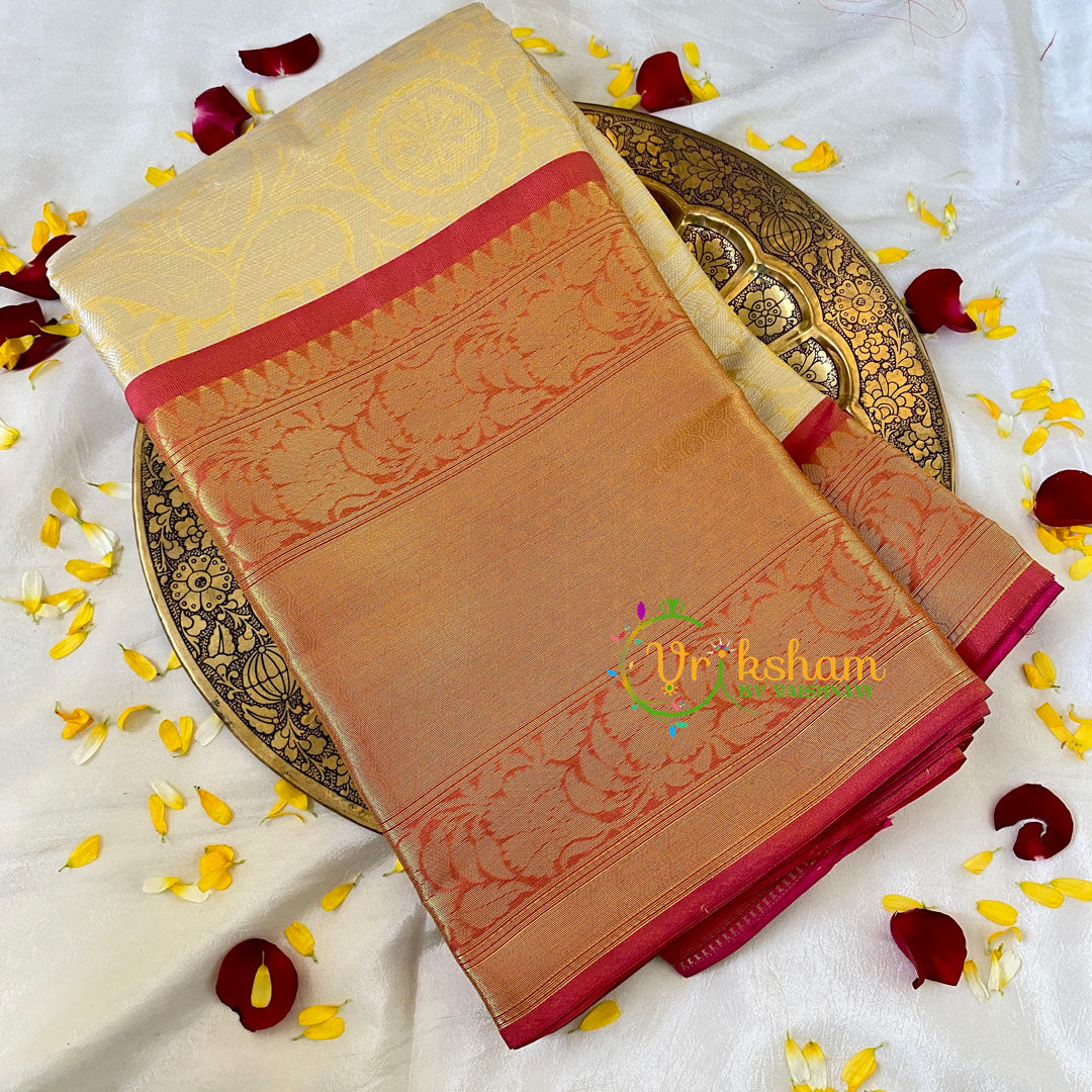 Colour and Material: Pastel Yellow Semi Benarasi Saree with red border.