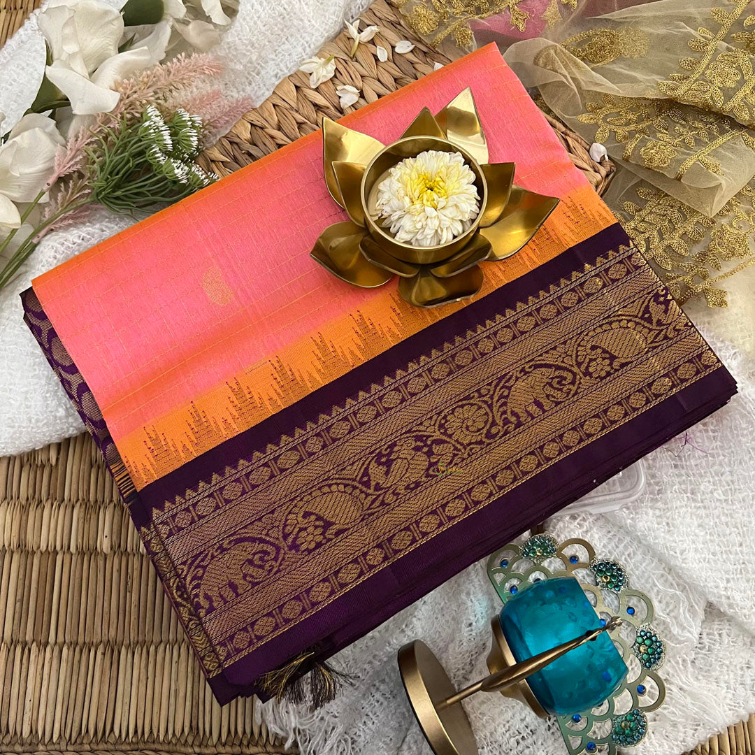 Elevate your style with our Peach Color Korvai Silk Cotton Saree! The beautiful peach hue is complemented by a stunning purple temple border and traditional Vairaoosi Podi Kattam with Butta design. Handloomed with the finest silk and cotton, this saree is sure to impress with its elegant look and feel.