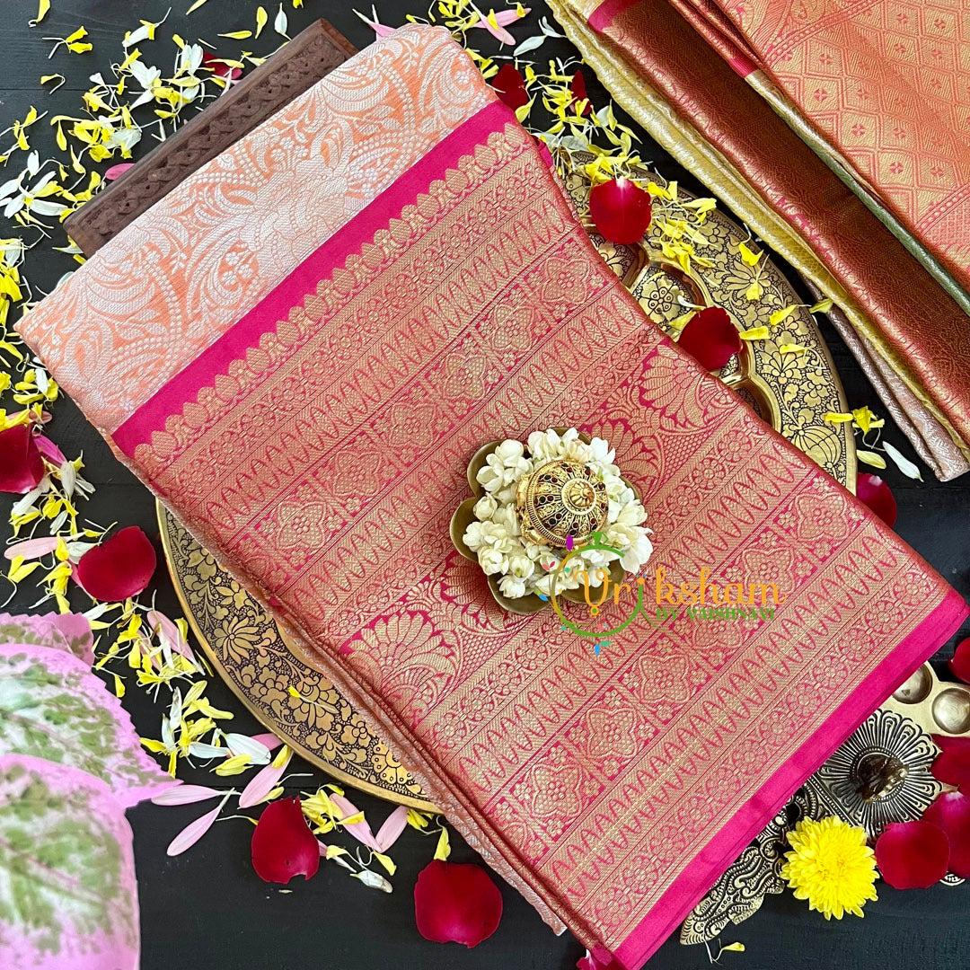 Peach Semi Benarasi Saree- Festive wear saree –silver like work throughout the saree; comes with Blouse attached. Two side border and pallu.