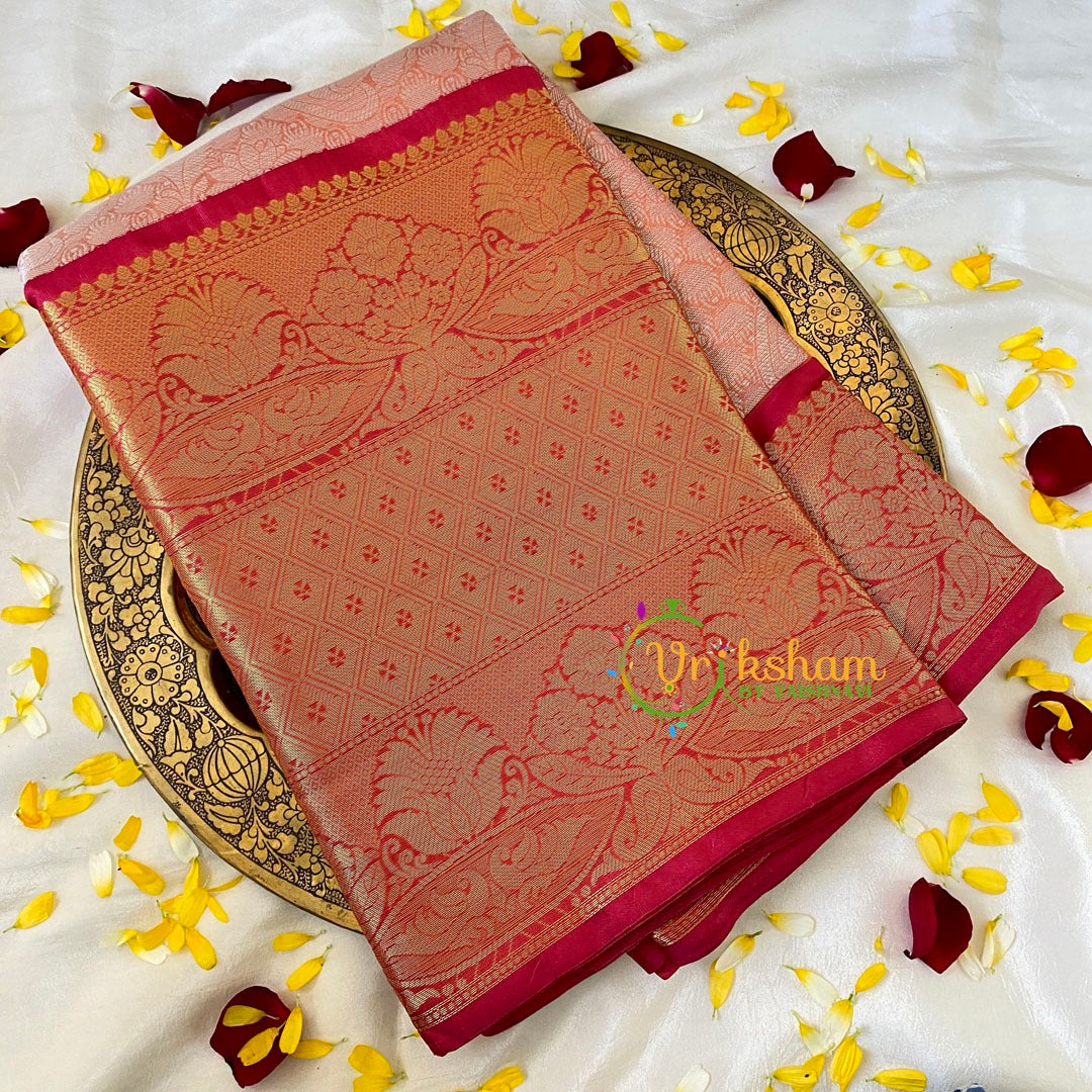 Peach Semi Benarasi Saree Festive wear saree –self work throughout the saree; comes with Blouse attached. Contrast two side border and pallu - one side bigger border.