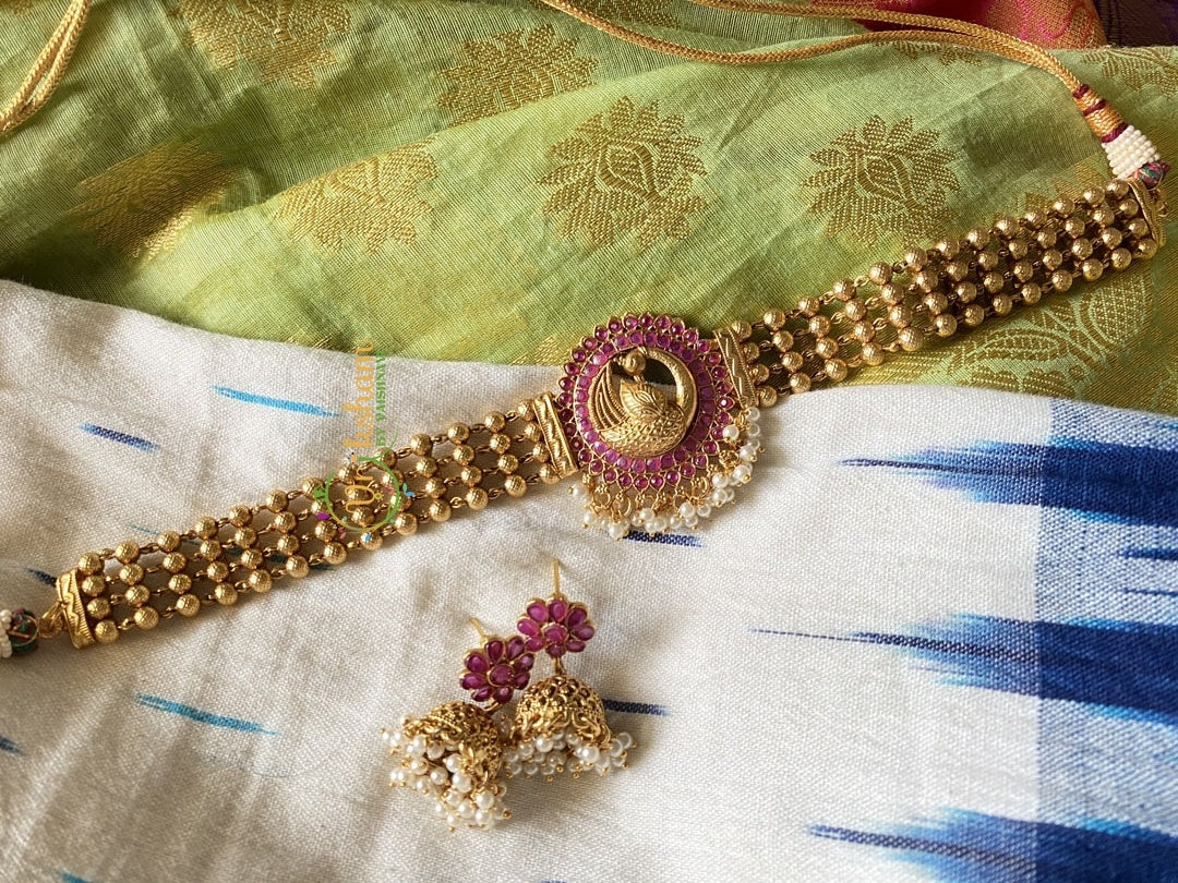 Peacock Pendant High Neck Choker- Red is a Elegant and Premium Quality gold look alike choker. This royal and elegant neckpiece can be worn as a high neck choker. It comes with earrings. The three thread style with inbetween golden peacock studs gives it a unique look.