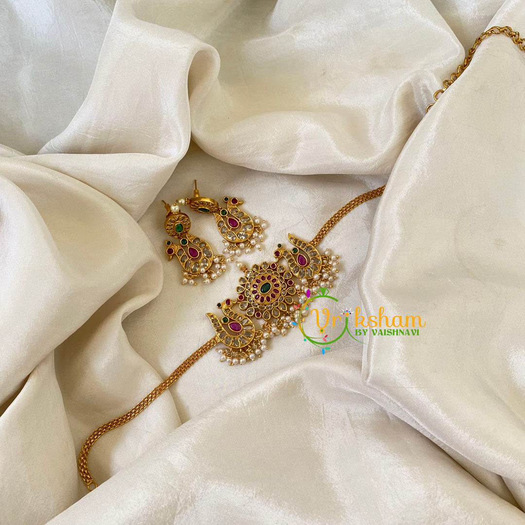 Peacock High Neck Choker is a Elegant and Premium Quality gold look alike choker. This royal and elegant temple neckpiece can be worn as a high neck choker. It does not come with earrings.