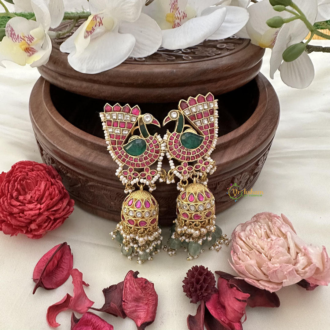 Elevate your style with our Peacock Jadau Kundan Jhumka earrings. Adorned with stunning aqua green beads and pearls, these earrings are the epitome of luxury and sophistication. Let the intricate peacock design and traditional kundan work be the perfect addition to your ensemble.